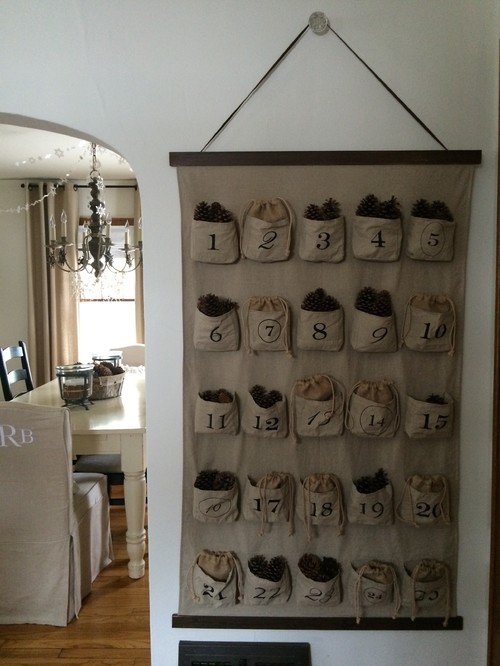 Rustic advent wall hanging. If you have a sewing machine, consider stitching up an advent calendar that can be reused from year to year. The one shown here uses nubby linen for a rustic look, with numbers stenciled onto the pockets with fabric paint.